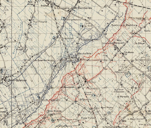The day dawned dull, misty and quiet and remained so all day. In the late afternoon preparations began for the relief of the Battalion, and of the Royal Scots. Baggage and company stores were carried out via Shaftesbury Avenue and company cooks were despatched to new billets in the western fringes of Bois Grenier. Later that evening, having been relieved by 8th Yorkshires, the Royal Scots marched back, via La Rolanderie, to rendezvous with the rest of their Battalion while most of 10DWR made their way to their new billets. By now, however, the village of Bois Grenier, as described by J.B. Priestley, was in ruins,